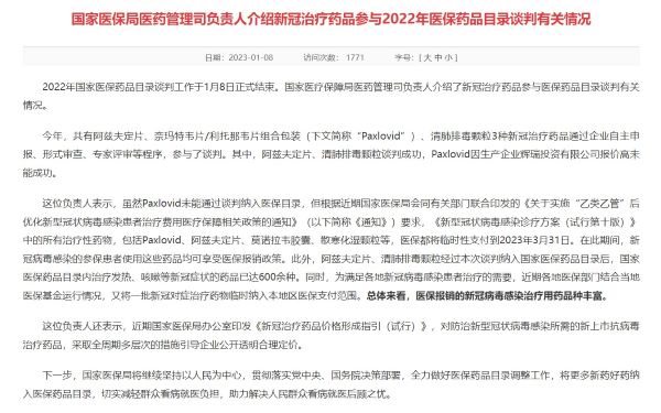 其中,阿兹夫定片、清肺排毒颗粒谈判成功,Paxlovid因生产企业辉瑞投资有限公司报价高未能成功。