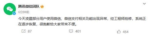腾讯微信团队回应功能异常:系统正在逐步恢复