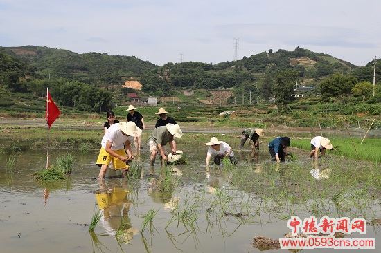 近日,福鼎法院组织党员干警前往福鼎市白琳镇沿州村开展“粮食安全共守护田间地头插秧忙”主题党日活动。活动现场,干警们纷纷卷起裤腿、走进水田,在农技人员的指导下参与插秧。据悉,该院干警共计认领水田30.2亩,以实际行动为粮食安全贡献力量。(文/图 李韩)