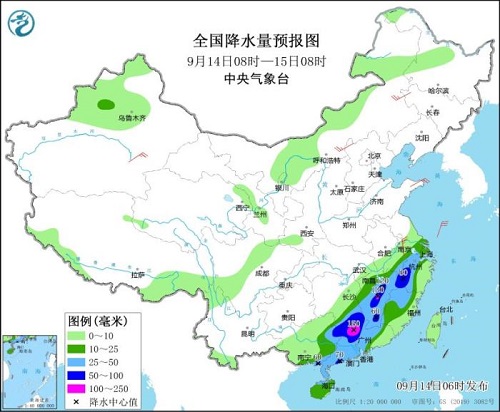 预计,9月14日08时至15日08时,安徽南部、浙江西部和北部、湖南东南部、江西东北部和中南部、福建西北部、广东中西部、广西东部等地部分地区有大到暴雨,其中,江西中部、广东西北部等地部分地区有大暴雨(100~150毫米)。上述部分地区伴有短时强降水(最大小时降雨量30~50毫米,局地可超过60毫米),局地有雷暴大风等强对流天气。中央气象台9月14日06时继续发布暴雨蓝色预警。