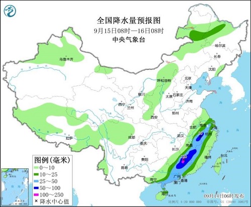 9月15日08时至16日08时,内蒙古东北部、黑龙江西南部、江淮东部和西部、江南中北部和南部、华南中北部和南部等地部分地区有中到大雨,其中,安徽南部、江西、福建西北部、广东西北部等地部分地区有暴雨或大暴雨(100~120毫米)。内蒙古东北部和中部、辽东半岛等地部分地区有4~5级风。