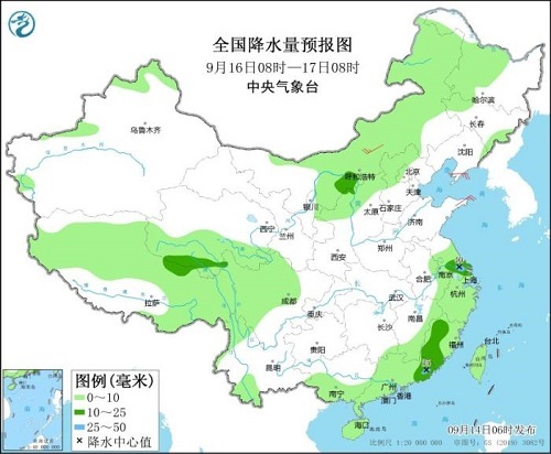 9月16日08时至17日08时,内蒙古东部和西部、黑龙江中西部、吉林西部、新疆北疆北部、西藏大部、西北地区中部、陕西北部、华北北部、江淮东部、江南中东部和南部、西南地区北部、四川盆地西北部、华南大部、台湾岛等地部分地区有小到中雨,其中,江苏中南部、广东东南部等地部分地区有大雨(25~40毫米)。内蒙古中部、辽东半岛、山东半岛等地部分地区有4~5级风。