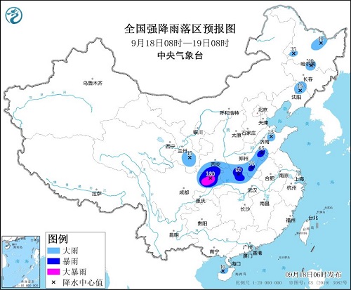 其中,9月18日08时至19日08时,四川东北部、重庆北部、甘肃东南部、陕西南部、湖北西北部、河南南部和东部、山东西南部以及黑龙江中西部、吉林中部、辽宁北部等地部分地区有大到暴雨,其中,四川东北部、重庆北部等地部分地区有大暴雨(100~160毫米)。上述部分地区伴有短时强降水(最大小时降雨量20~50毫米,局地可超过60毫米),局地有雷暴大风等强对流天气。