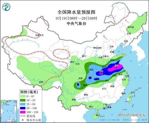 9月18日08时至19日08时,黑龙江大部、吉林中部、辽宁北部、甘肃南部、宁夏中南部、陕西南部、四川东北部、重庆北部、湖北西部和北部、河南大部、山东大部等地部分地区有中到大雨,其中,四川东北部、重庆北部、陕西东南部、湖北北部、河南南部、山东西南部等地部分地区有暴雨,局地有大暴雨(100~160毫米)。内蒙古东部、东北地区大部、河北北部等地部分地区有4~5级风。