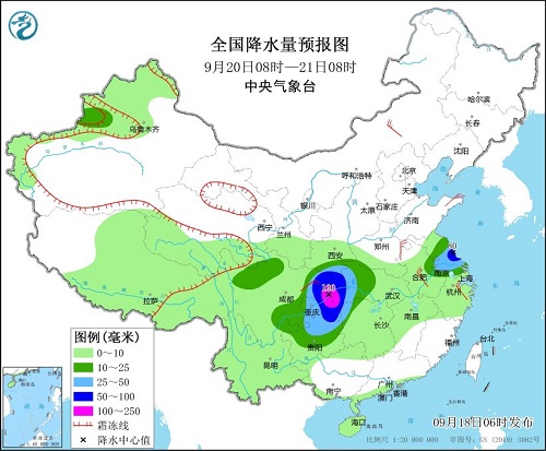 全国降水量预报图(9月19日08时-20日08时)。来源:中央气象台网站