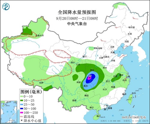 9月20日08时至21日08时,新疆伊犁河谷、西北地区东南部、湖北西部、西南地区东部等地部分地区有中到大雨,其中,陕西南部、湖北西部、四川盆地东北部、重庆中北部等地部分地区有暴雨或大暴雨(100~140毫米)。内蒙古东北部和中部、黑龙江西北部、辽东半岛、山东半岛等地部分地区有4~5级风。