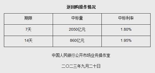 中新网9月20日电 据央行网站消息,为维护季末流动性平稳,2023年9月20日人民银行以利率招标方式开展了2910亿元7天期和14天期逆回购操作。具体情况如下: