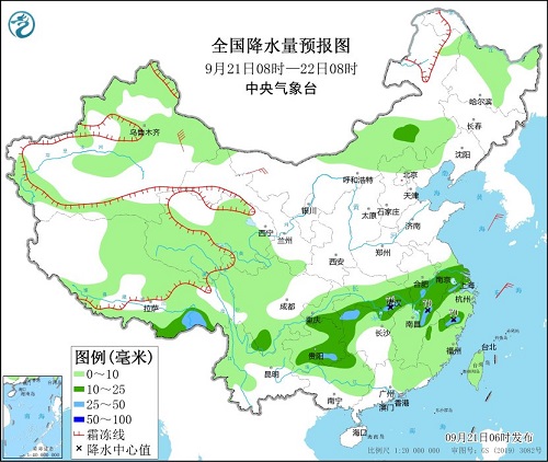 全国降水量预报图(9月21日08时-22日08时)。图片来源:中央气象台网站