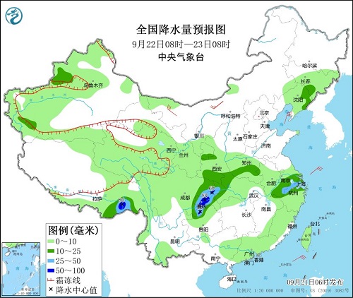 全国降水量预报图(9月22日08时-23日08时)。图片来源:中央气象台网站