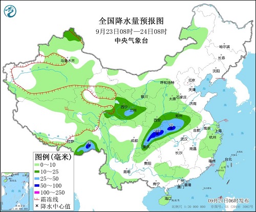 9月23日08时至24日08时,新疆北疆北部、西藏东南部、青海东部、甘肃西南部、陕西东南部、河南中西部、四川东部、重庆中西部、湖北西部等地部分地区有中到大雨,其中,西藏东南部、湖北北部和西部、四川盆地东北部、重庆中北部等地部分地区有暴雨,局地大暴雨(100~110毫米)。青海西部部分地区有5~6级风。