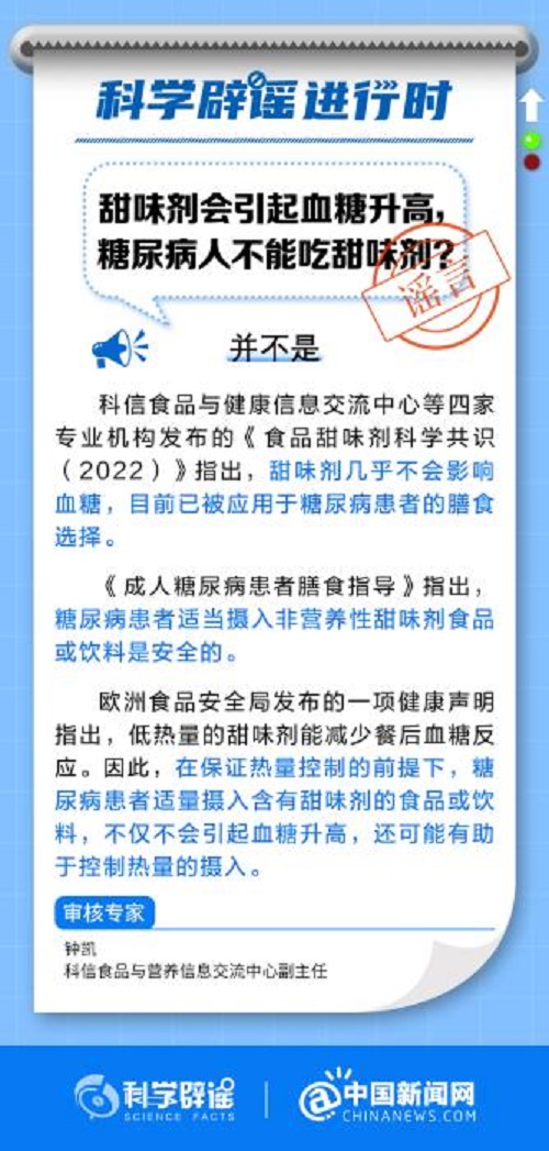 中新网9月21日电 甜味剂几乎不会影响血糖,目前已被应用于糖尿病患者的膳食选择。低热量的甜味剂能减少餐后血糖反应,因此,在保证热量控制的前提下,糖尿病患者适量摄入含有甜味剂的食品或饮料,不仅不会引起血糖升高,还可能有助于控制热量的摄入。(来源:@科学辟谣 @中国新闻网 )