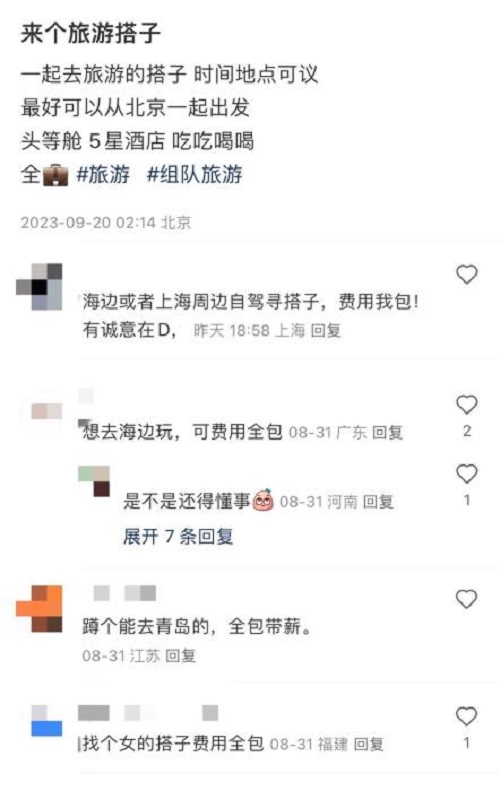 还有人在自称“旅游费用全包”的帖子里附带了自己的年龄、身高等自我介绍,以及对女方的年龄、性格要求。在另一篇正常寻找“旅游搭子”的帖子里,评论区也有多人留言称“找个女搭子,费用全包”“蹲个能去xx的,全包带薪”。