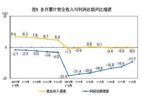 1—8月份,规模以上工业企业实现营业收入84.33万亿元,同比下降0.3%;发生营业成本71.83万亿元,增长0.2%;营业收入利润率为5.52%,同比下降0.71个百分点。