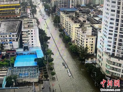 受暴雨影响,海口市区多条道路积水,小汽车无法通行。海口交警供图