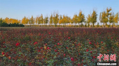 中新网陕西榆林10月26日电 (吴西檬)深秋时节,位于榆林市榆阳区的补浪河女子民兵治沙连内绿茵成片。由马鞭草、百日菊、沙漠玫瑰等花卉品种构成的沙漠花海,仿佛一幅绚丽的油画。当微风轻拂,连片的植被轻轻摇曳,似乎在述说着曾经的荒凉与如今的生机勃发。