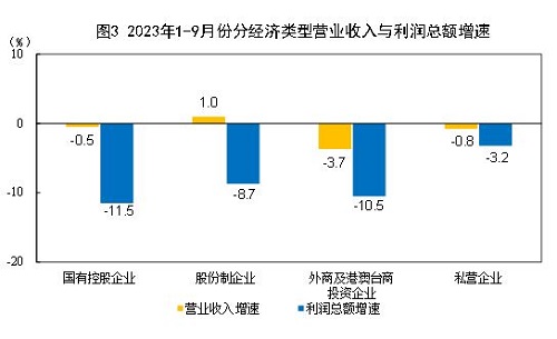 1-9月份,规模以上工业企业中,国有控股企业实现利润总额18477.0亿元,同比下降11.5%;股份制企业实现利润总额39623.7亿元,下降8.7%;外商及港澳台商投资企业实现利润总额12878.1亿元,下降10.5%;私营企业实现利润总额14385.0亿元,下降3.2%。