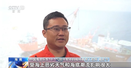 中国海油乐东10-1气田开发项目现场首席工程师 喻发令:乐东10-1气田新建平台安装受海上恶劣天气和海底潮流影响很大,且导管架重量和高度均接近起重船作业能力极限。项目团队采用船艏顶流作业模式克服海流影响,在75小时的极限作业窗口下,完成导管架坐底就位;同时通过实时精细控制船舶动态,实现了上部组块和导管架精准合龙。