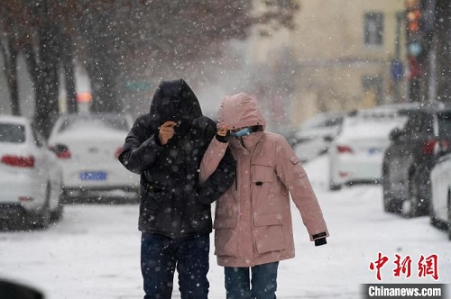 11月6日,哈尔滨市民在雪中匆匆而行。赵宇航 摄