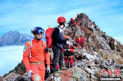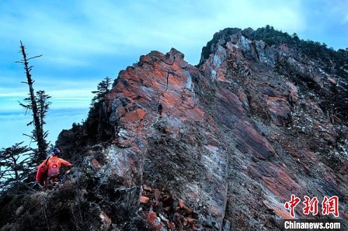 救援人员正在翻越山峰搜寻被困驴友。程飞 摄