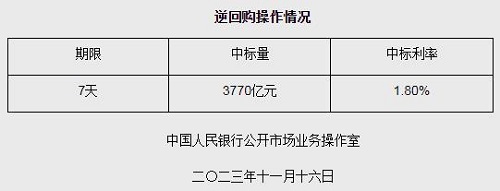 中新网11月16日电 据央行网站消息,为维护银行体系流动性合理充裕,2023年11月16日人民银行以利率招标方式开展了3770亿元逆回购操作,中标利率1.80%,期限为7天。具体情况如下: