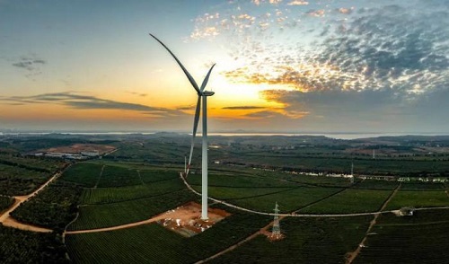 落日余晖与高大的风力发电机绘就了一幅人与自然和谐共生的优美画面/摄影樊哲平