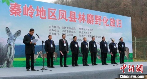中新网陕西宝鸡11月22日电 (阿琳娜 师蕊)由陕西省林业局和宝鸡市人民政府主办,宝鸡市林业局和凤县人民政府承办的“秦岭地区凤县林麝野化放归活动”在宝鸡市凤县黄牛铺镇三岔河村宽滩举行。10只佩戴北斗卫星定位项圈的林麝欢快地向秦岭密林深处飞奔而去。