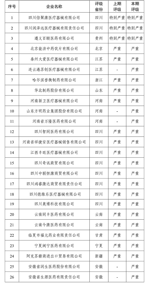 上述结果显示,3家被评定为“特别严重”的医药企业分别为四川倍聚康医疗器械有限公司、四川润泽远医疗器械有限责任公司、遵义百颐医药有限公司。