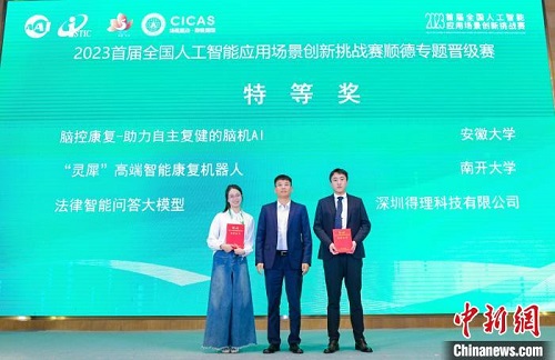 在当日上午举办的晋级赛中,来自全国各地的40个参赛团队进入现场路演答辩,包括智能养老、智能助残康复、智能医疗、智能供应链、智能营销和智能博弈6大场景赛道。最终,南开大学“‘灵犀’高端智能康复机器人”、安徽大学“脑控康复-助力自主复建的脑机AI”、深圳得理科技有限公司“法律智能问答大模型”等三个项目获得特等奖。分别为:深圳沧穹科技有限公司“高精度音频定位芯片Kepler A100及其产业化应用”、果不其然无障碍科技(苏州)有限公司“译语-数字赋能助力听障人士走出无声世界”、中国地质大学“精智入微-多型号微波滤波器智能精密调试开创者”等项目获一等奖。