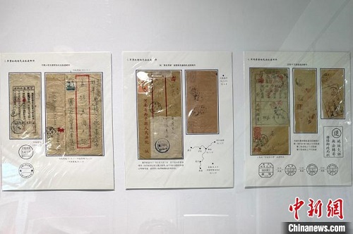 “90后”张融琦收藏的邮品在黄浦区文化馆展出。 中新网记者 王笈 摄