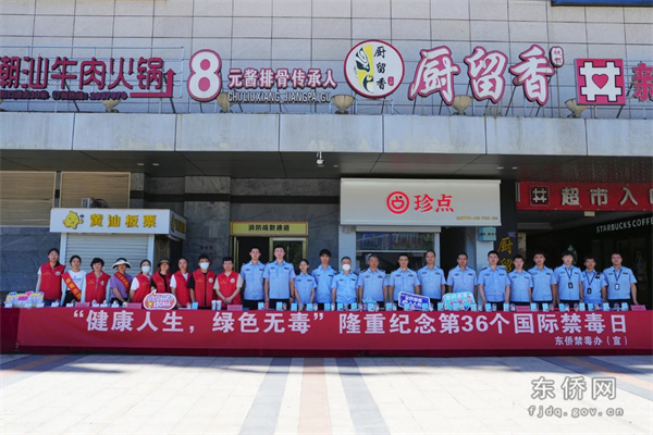 东侨网消息(黄玲玲)今年6月26日是第36个国际禁毒日,为进一步加大禁毒宣传教育工作力度,营造“6.26”国际禁毒日浓厚氛围,提高禁毒、增强市民群众禁毒意识,6月26日上午,东侨禁毒办联合东侨公安分局、东侨宣传部、东侨社会事务局、市场监管局、社区服务中心、卫生健康服务中心、兰亭社区等禁毒委成员单位开展禁毒宣传活动。