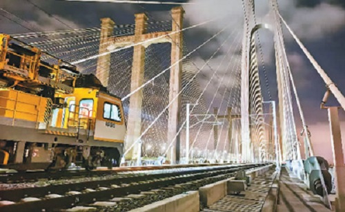 “我们还要对桥上每个定位器导高进行测量,标准为5.3米,允许误差正负5毫米,导高几毫米的误差都会对列车行驶产生影响。”许腾伟形容,大桥运维是个精细活儿,调力矩、紧螺母、盯落槽,眼神要像鹰,手上会“绣花”。