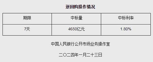 中新网1月23日电 据央行网站消息,为维护银行体系流动性合理充裕,2024年1月23日人民银行以利率招标方式开展了4650亿元逆回购操作,中标利率1.80%,期限为7天。具体情况如下: